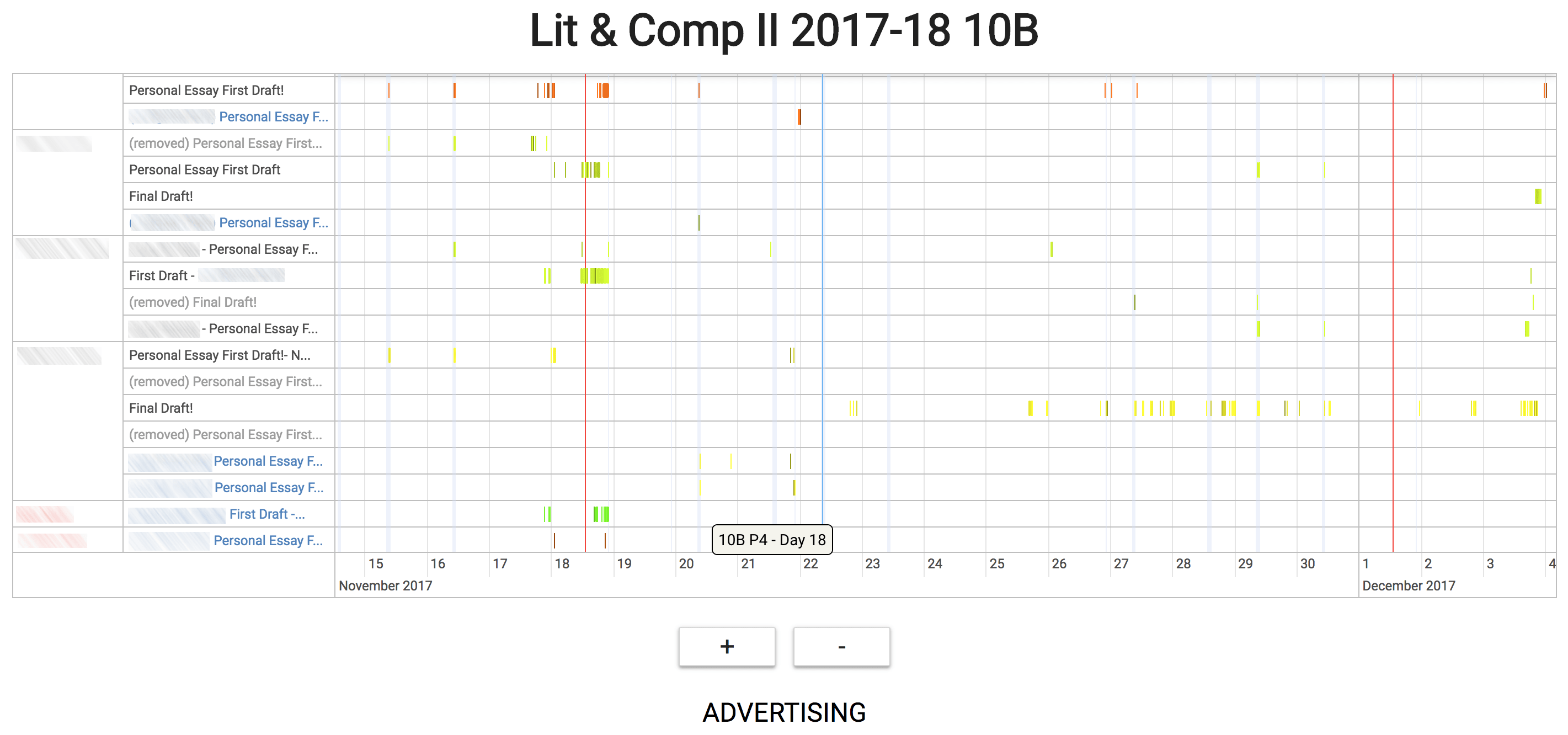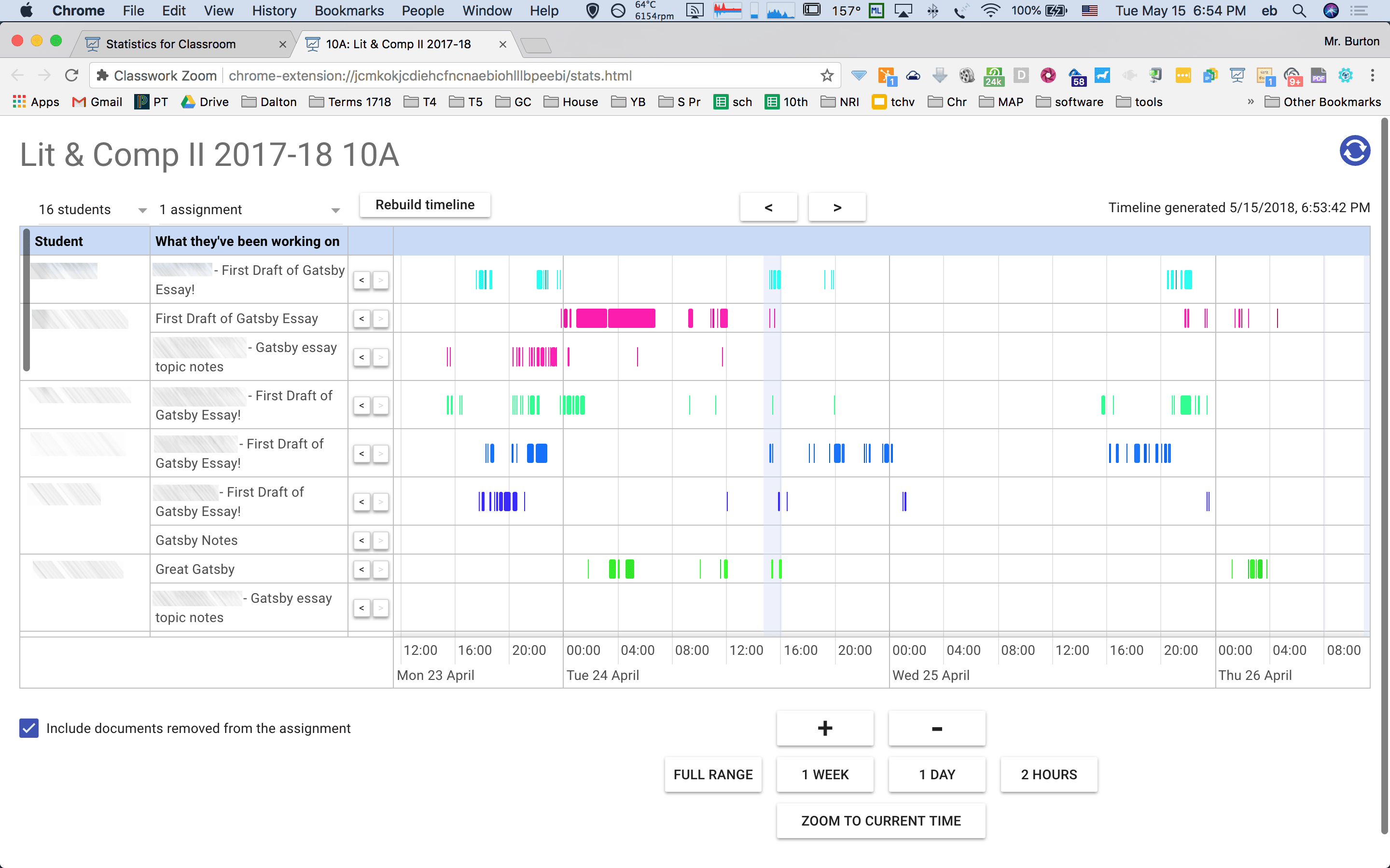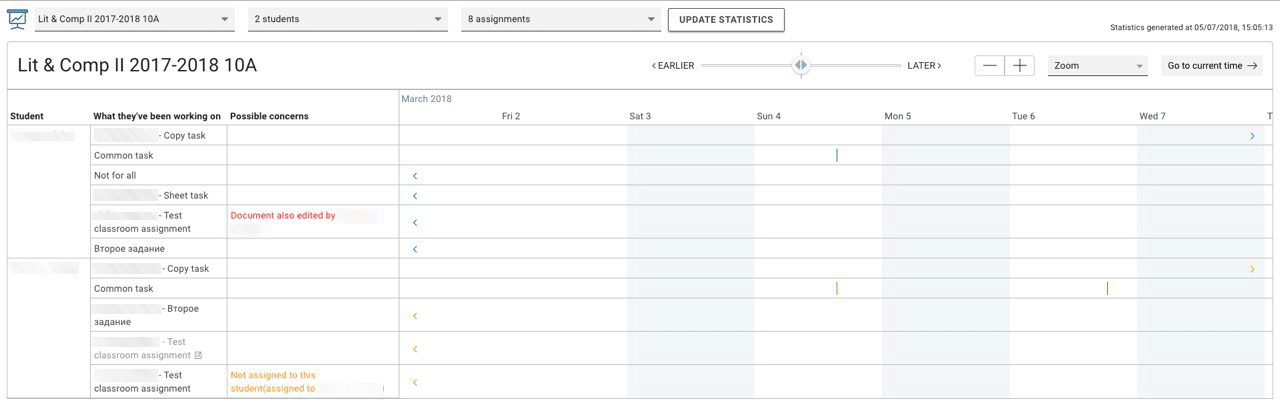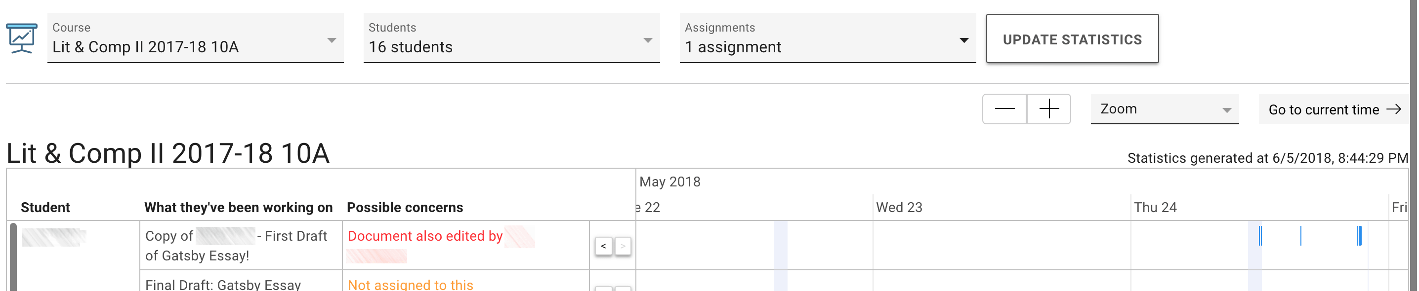 While drafting the terms of reference, the developers closely studied the principles behind the Draftback extension for Google Documents. The main function of Draftback is to allow a user to literally play back the revision history of any document, but it also offers statistics on the timing and amount of work done in an individual document, which was of more interest to our client. Using the information available in the Google Classroom API, we were able to provide statistics and data visualization of work for an entire class at one time, including multiple assignments at a time selected from Google Classroom through the user’s teacher account. To respect privacy concerns, we chose to store all data on the user’s device.